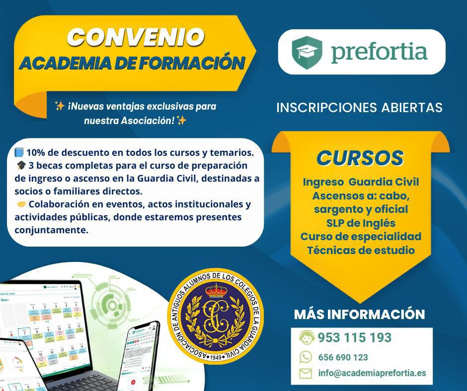 Nos complace anunciar la firma de un nuevo convenio de colaboración entre la Asociación de Antiguos Alumnos de los Colegios de la Guardia Civil y PREFORTIA, reconocida academia especializada en formación para el ingreso, ascenso y desarrollo profesional dentro de la Guardia Civil.
